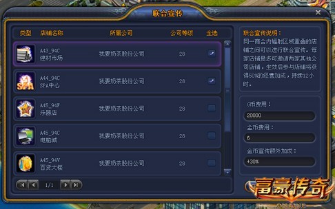 说起宣传大家并不陌生,但如果说到店铺联合宣传也许很多朋友都会感到不知所云。作为本次的新内容之一,联合宣传将为我们带来新的经营加成。和同一商会内辐射区域有重叠的店铺可以展开联合宣传,成功后的经营加成最高可达80%之多。有了它的帮助,公司升级又轻松了许多吧!