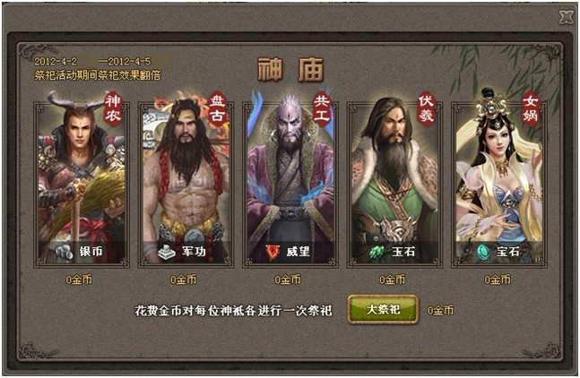 通过祭祀可以获得银币、军功、威望、玉石、宝石,活动期间效果翻倍!