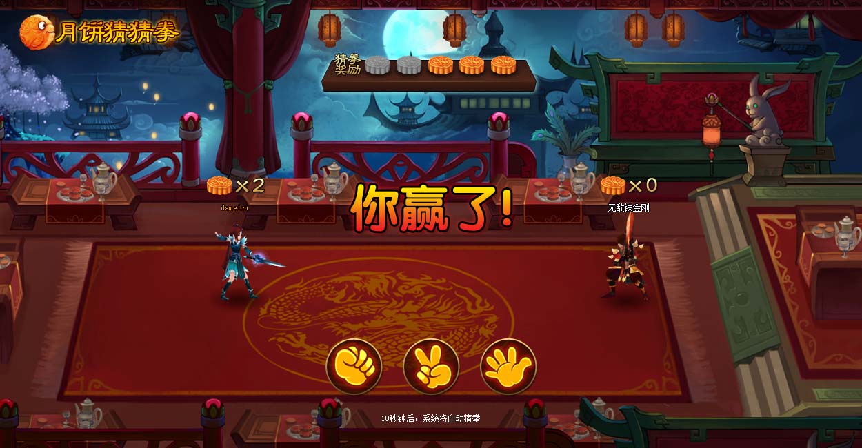 活动说明:两人进行猜拳,胜者获得奖励月饼。一个月饼可兑换5万铜钱,每人每天可进行猜拳5次。
