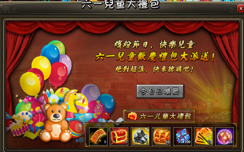 活动期间,玩家可购买六一欢庆礼包,只需花费200金币,即可获取丰厚奖励,机不容失,赶紧来抢购吧。温馨提示:活动期间,玩家每天尽可购买一个喔~~~