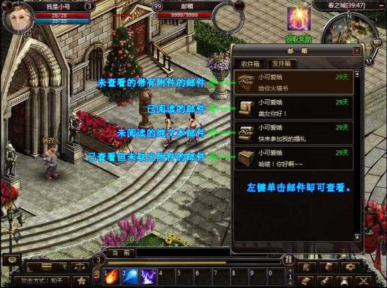 1.收发邮件都是在邮箱NPC处进行的。在华景村的(106,29)和春之城的(37,46)分别有一个邮箱NPC。